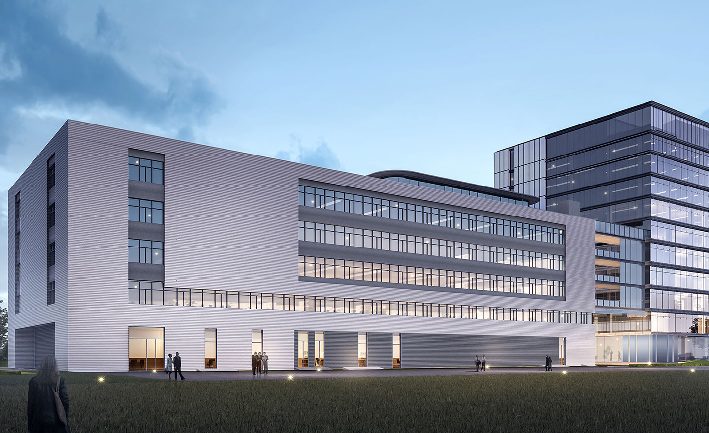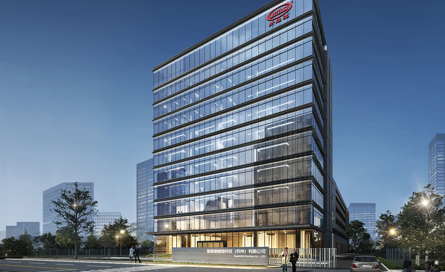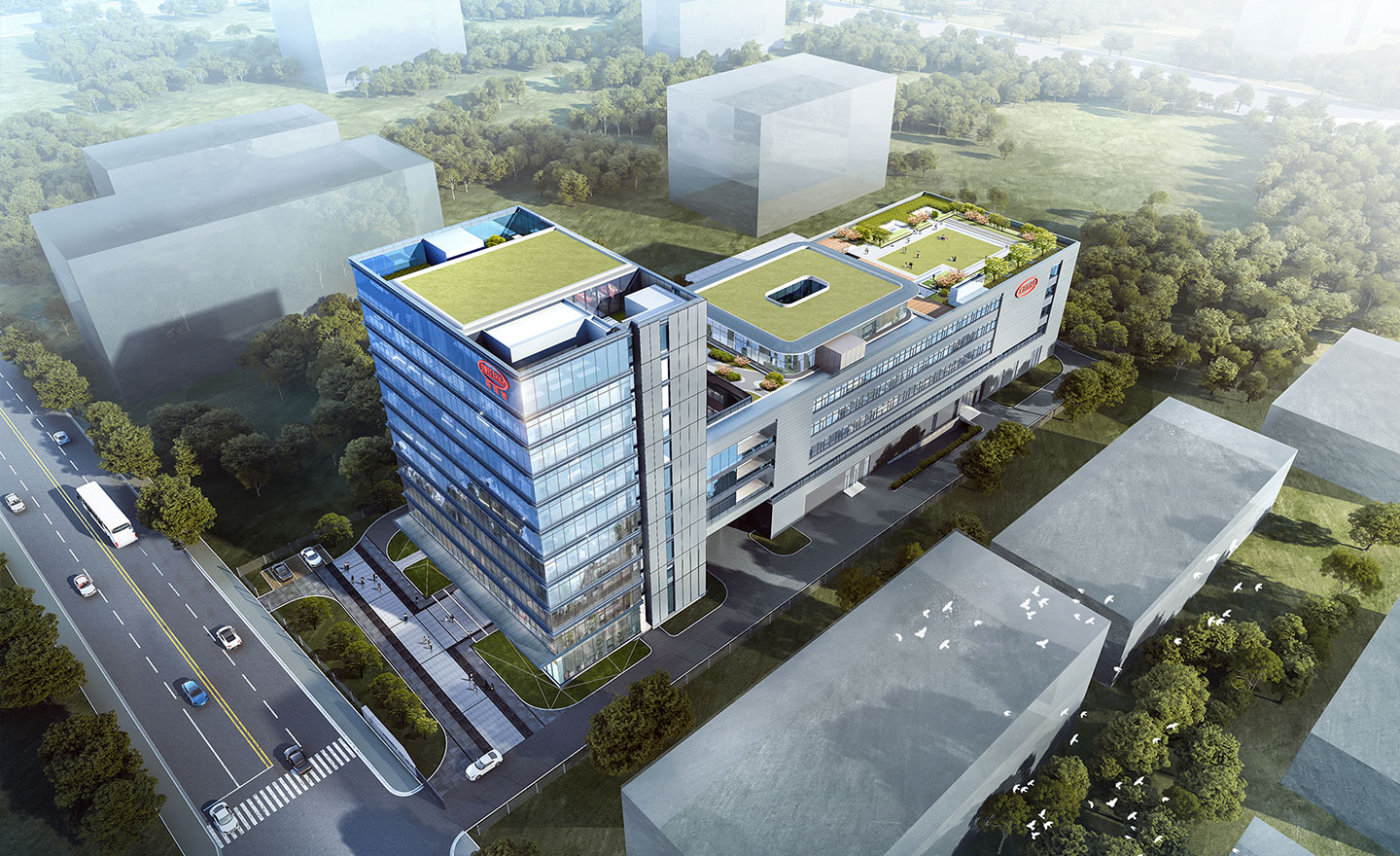 設計時間:2021 年建筑造型上,立面處理以簡潔為主,推崇建筑大師密斯凡德羅的 Less is more 的設計理念的,盡顯德國工業之風。辦公樓大面積的玻璃幕墻潔凈通透,就像城市的展示窗口,使得室內外環境能更好的的滲透。主立面鋁板與玻璃面橫向鑲嵌,簡潔有力,勾勒出建筑干練線條。在辦公和廠房的頂層都大量設計的屋頂花園,豐富了建筑的第五立面。
