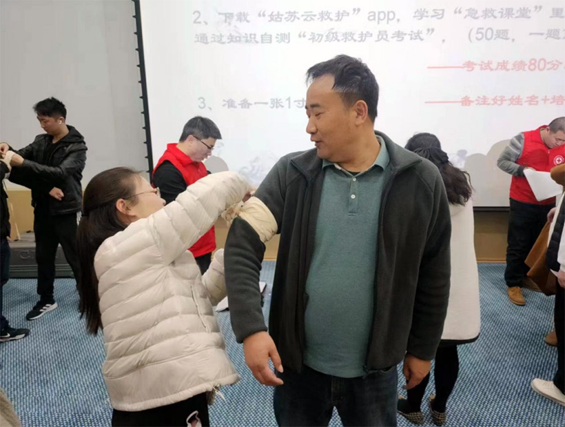 隨后,學員們被分成2個小組,在兩位志愿者的指導下開展手臂包扎、心肺復蘇的實操訓練。參訓學員仔細聆聽并跟著志愿者認真練習,手法由生疏到熟練,逐漸掌握急救技能的操作要領(lǐng),最終掌握了包扎的手法、心肺復蘇的操作,提高了應急救護能力,通過了實踐考試。大家受益匪淺。