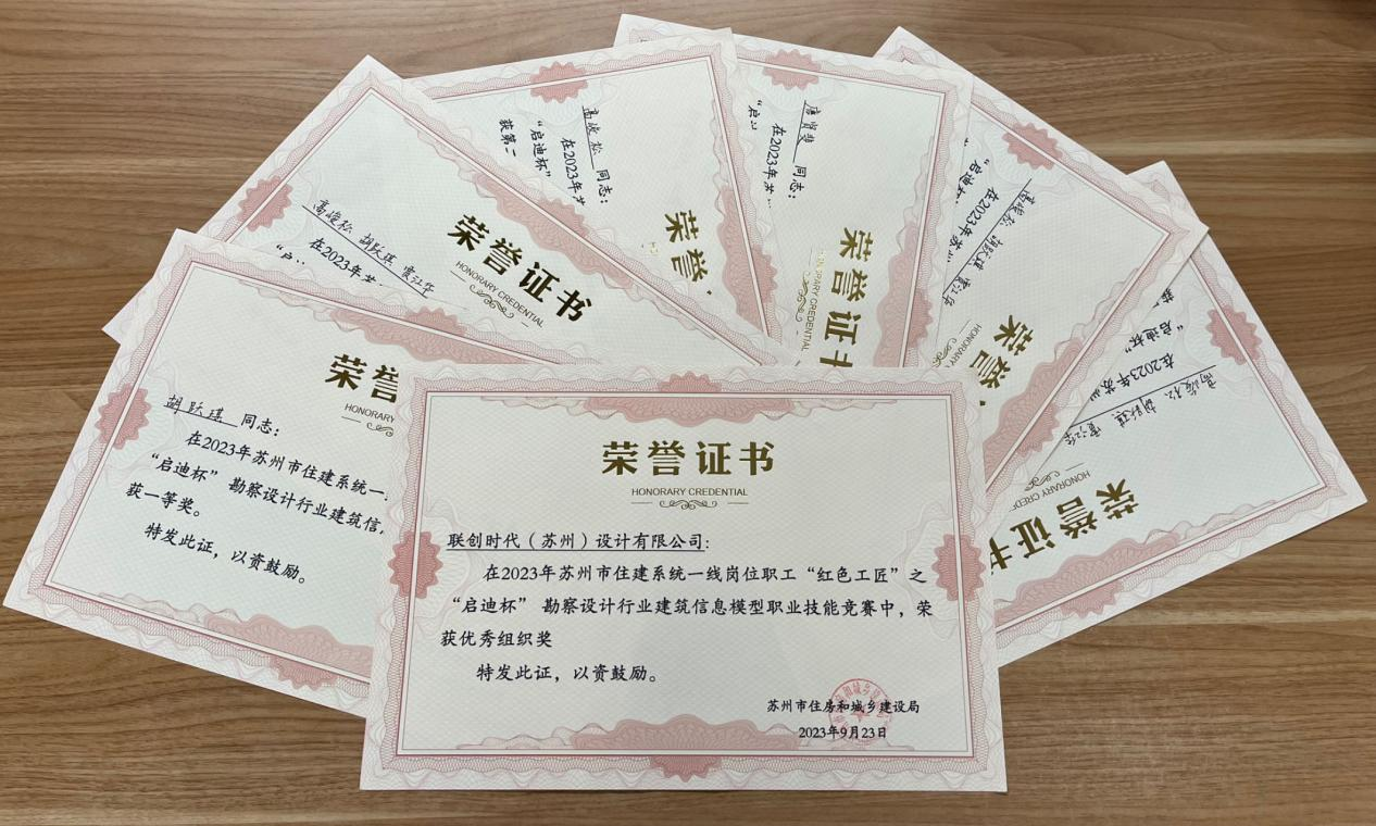 2023年9月22-23日,市住建局、市總工會、市人社局、團市委聯合主辦,市勘察設計協會承辦的2023年蘇州市住建系統一線崗位職工“紅色工匠”之“啟迪杯”勘察設計行業建筑信息模型職業技能竟賽在蘇州建設交通高等職業技術學校順利舉行。在這次比賽中,公司參賽組成員勇創佳績:高峻松榮獲金獎第二名,胡躍琪榮獲一等獎,唐賢斐榮獲工作先進個人,公司榮獲團隊二等獎及優秀組織獎。